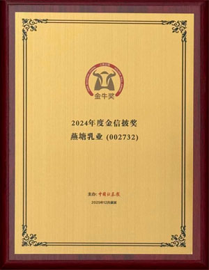 12月6日,由中国证券报主办的2025科创投资大会暨上市公司金牛奖(金信披奖)颁奖典礼在安徽合肥举办。燕塘乳业凭借在公司治理、信息披露、投资者关系管理等方面的优异表现,荣获2024年度上市公司金牛奖“金信披奖”。