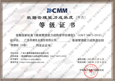 日前,燕塘乳业正式通过中国电子信息行业联合会评审,荣获国家数据管理能力成熟度(DCMM)认证,评估等级达到稳健级(三级),标志着公司实现数据全生命周期规范化、标准化、智能化管控,在数据资产化管理与价值挖掘方面迈进行业前列。